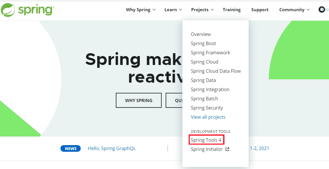 1. spring.io 홈페이지 접속후 Projects -> Spring Tools 4 선택