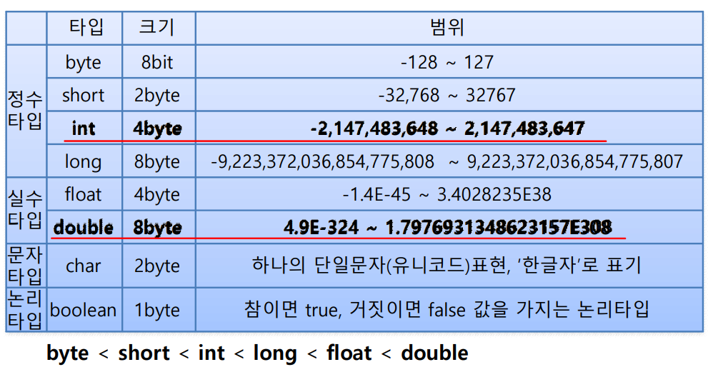- 정수 타입 : byte, short, int, loing