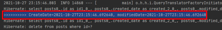System.out.println(">>>>>>>>>> CreateDate="+posts.getCreatedDate()+", modifiedDate="+posts.getModifiedDate());