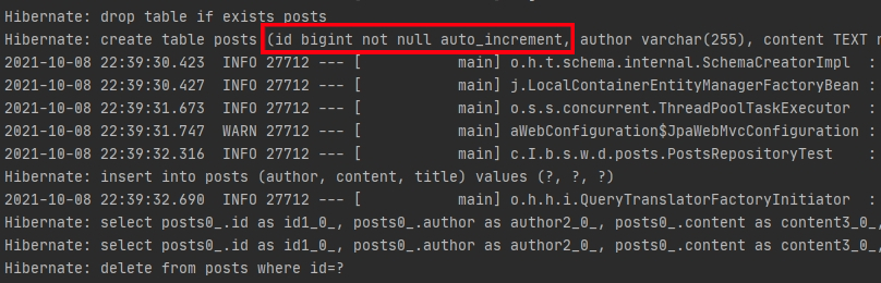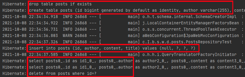 테스트 수행시 콘솔에서 쿼리 로그 확인 가능