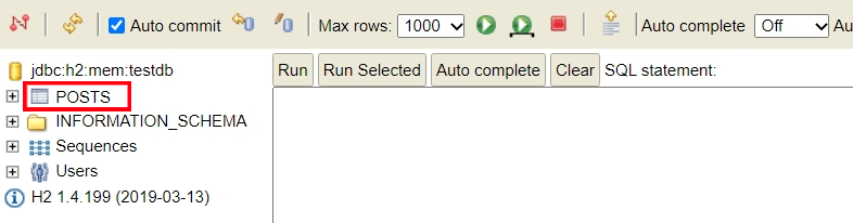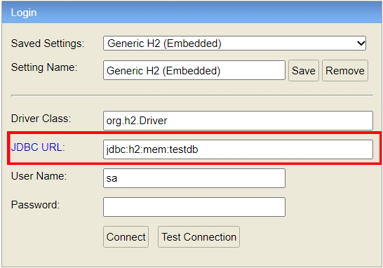 JDBC URL -> jdbc:h2:mem:testdb 작성