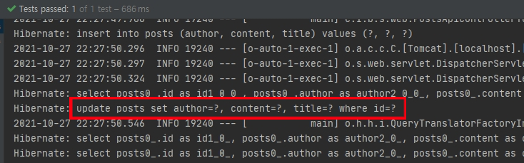 테스트 코드 성공 및 update 쿼리 실행 확인