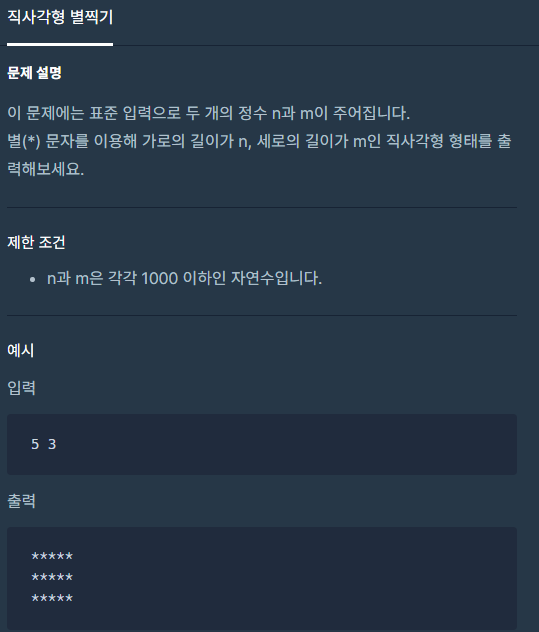 이 문제에는 표준 입력으로 두 개의 정수 n과 m이 주어집니다. 별(*) 문자를 이용해 가로의 길이가 n, 세로의 길이가 m인 직사각형 형태를 출력해보세요. 제한 조건 n과 m은 각각 1000 이하인 자연수
