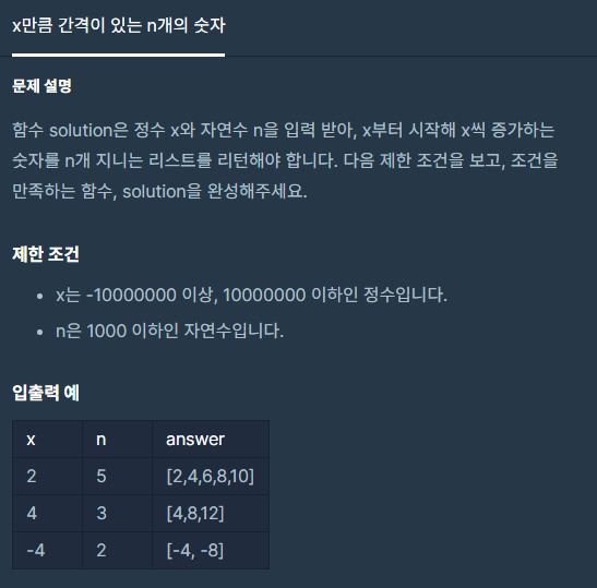 함수 solution은 정수 x와 자연수 n을 입력 받아, x부터 시작해 x씩 증가하는 숫자를 n개 지니는 리스트를 리턴해야 합니다. 다음 제한 조건을 보고, 조건을 만족하는 함수, solution을 완성해주세요.