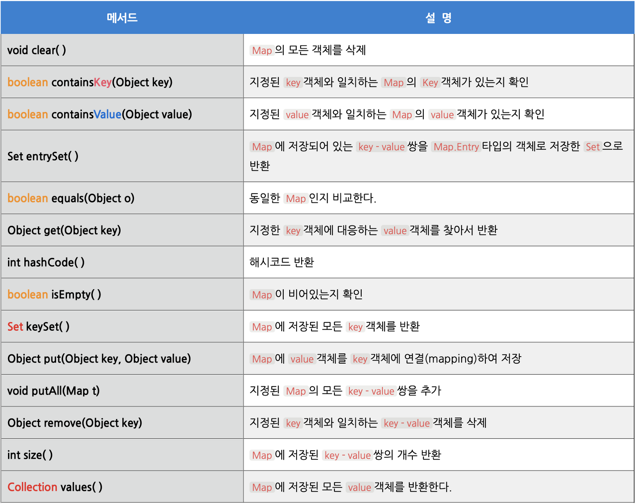 Map 인터페이스에서 값은 중복을 허용하기 때문에 Collection 타입으로 반환하고, 키는 중복을 허용하지 않기 때문에 Set 타입으로 반환한다.