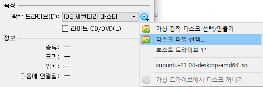 14. 속성 - 광학드라이브 선택 후 디스크(xubuntu 파일 다운로드 디렉터리) 파일 선택