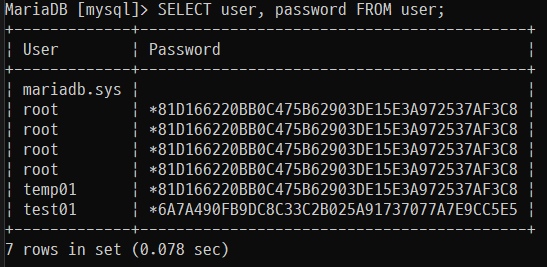 SELECT user, password FROM user;