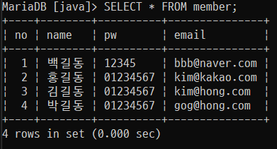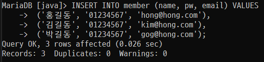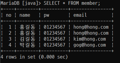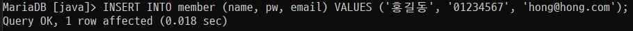 INSERT INTO member (name, pw, email) VALUES ('홍길동', '01234567', 'hong@hong.com');