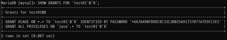 GRANT ALL PRIVILEGES ON java.* TO 'test01'@'%';