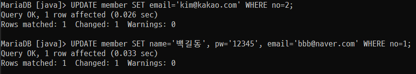 UPDATE member SET email='kim@kakao.com' WHERE no=2; // whwer 조건절은 p키