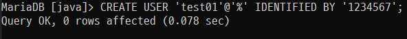 CREATE USER 'test01'@'%' IDENTIFIED BY '1234567';