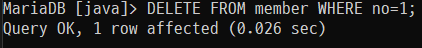DELETE FROM member WHERE no=1;