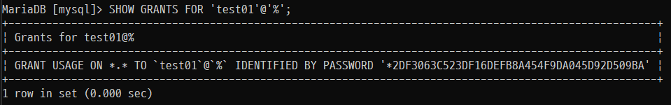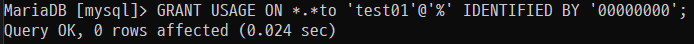 GRANT USAGE ON *.*to 'test01'@'%' IDENTIFIED BY '00000000';