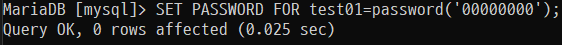 UPDATE user SET password=password('000000000') WHERE user='test01';
