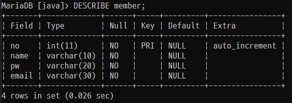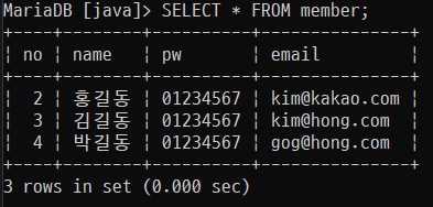INSERT INTO member (name, pw, email) VALUES ('홍길동', '01234567', 'hong@hong.com');