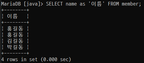 SELECT name as '이름' FROM member; //name 컬럼 별칭 정하기