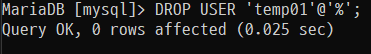 REVOKE ALL ON 데이터베이스.* FROM 'temp01'@'%';