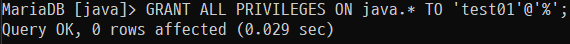 GRANT ALL PRIVILEGES ON java.* TO 'test01'@'%';