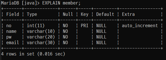 테이블의 구조는 컬럼이름/컬럼타입/컬럼길이로 구성