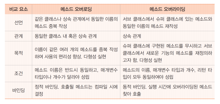 | 추상 클래스 | 추상 클래스는 서브 클래스에서 필요로 하는 대부분의 기능을 구현하여 두고 서브 클래스가 상속받아 활용할 수 있도록 하되, 서브 클래스에서 구현할 수밖에 없는 기능만을 추상 메소드로 선언하여, 서브 클래스에서 구현하도록 하는 목적(다형성) | - 추상 메소드와 일반 메소드 모두 포함 - 상수, 변수 필드 모두 포함 |